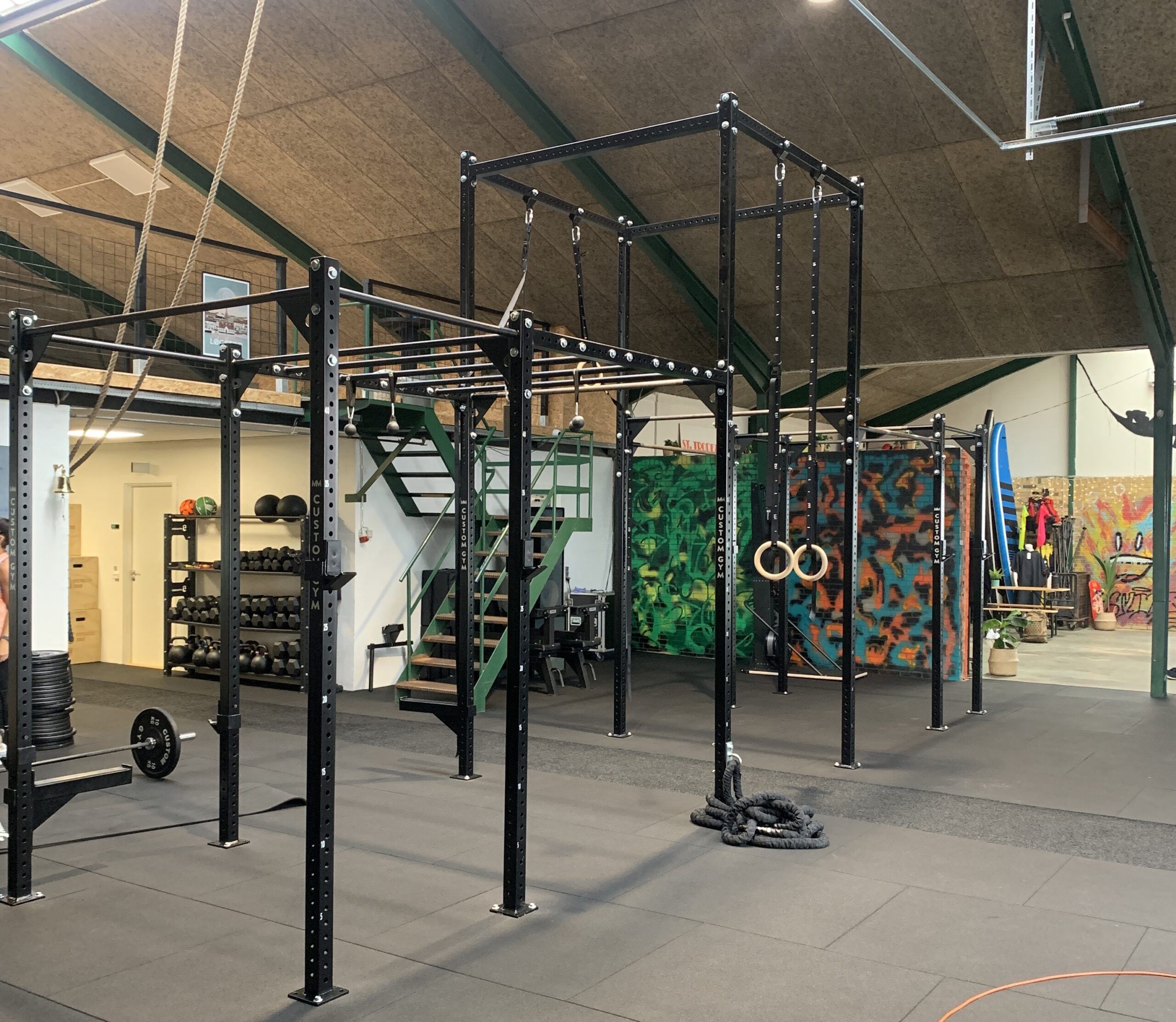 Hos DOK55 i Løgstør har vi hjulpet med at etablere et funktionelt træningsmiljø, hvor der er fokus på fri bevægelse, styrke og variation. Træningsområdet er udstyret med et stort custom rig, der giver mulighed for alt fra pull-ups og ringtræning til rebklatring og funktionelle øvelser.
