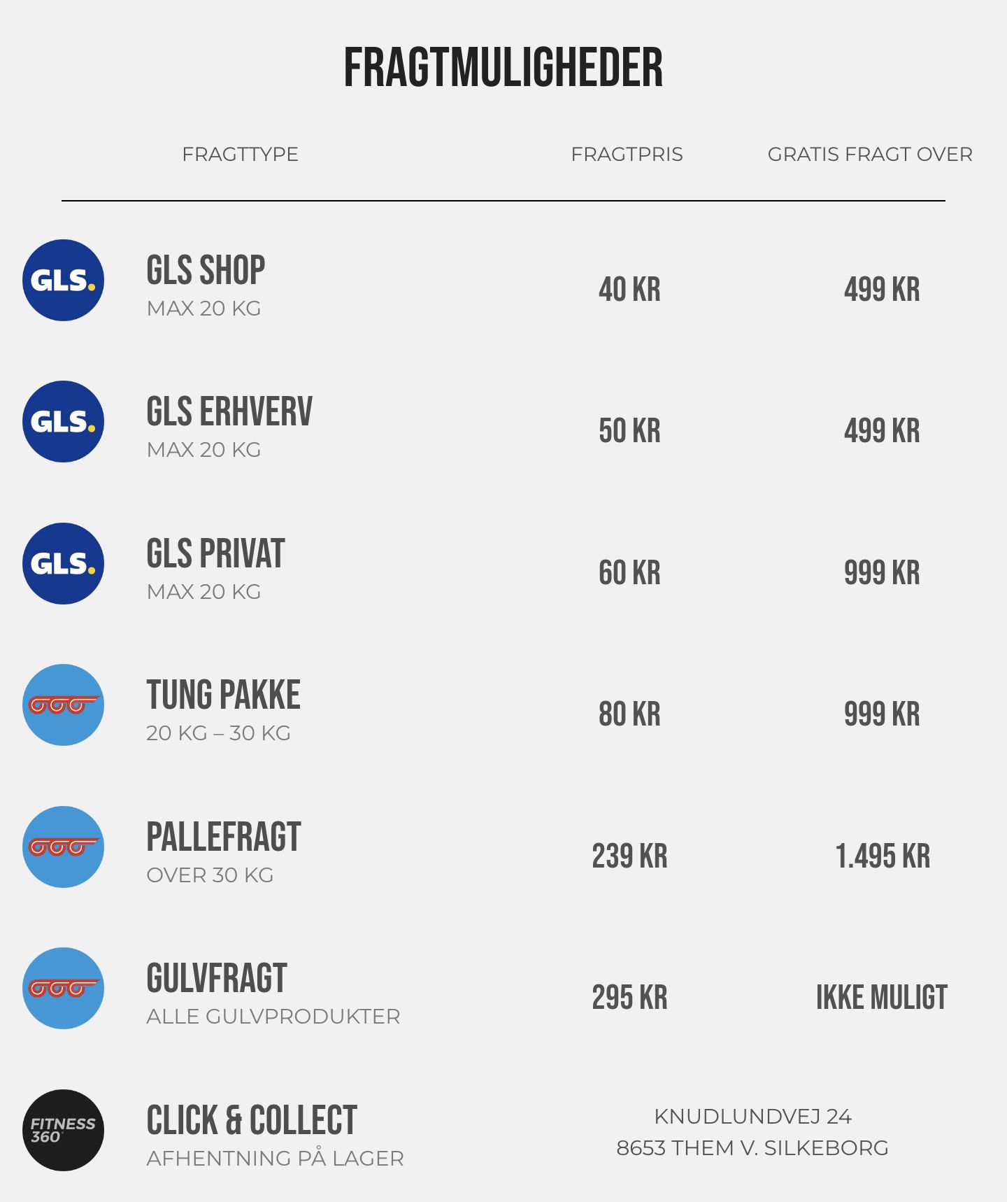 Vær opmærksom på at GLS forbeholder sig ret til at levere til en anden pakkeshop end den af kunden valgte pakkeshop. Det kan eksempelvis ske hvis den valgte pakkeshop er fyldt. Dette kan Fitness360 ikke holdes til ansvar for.