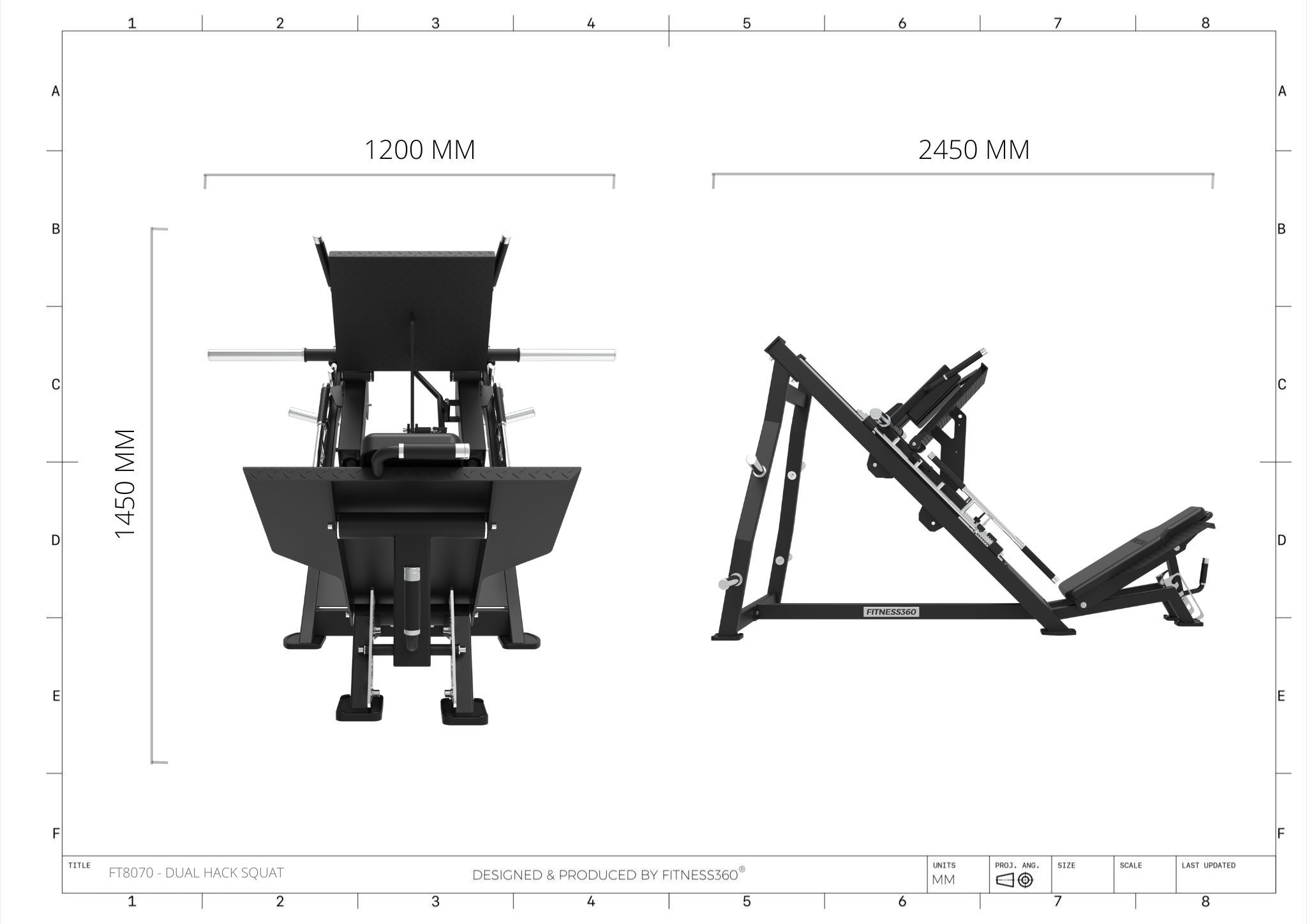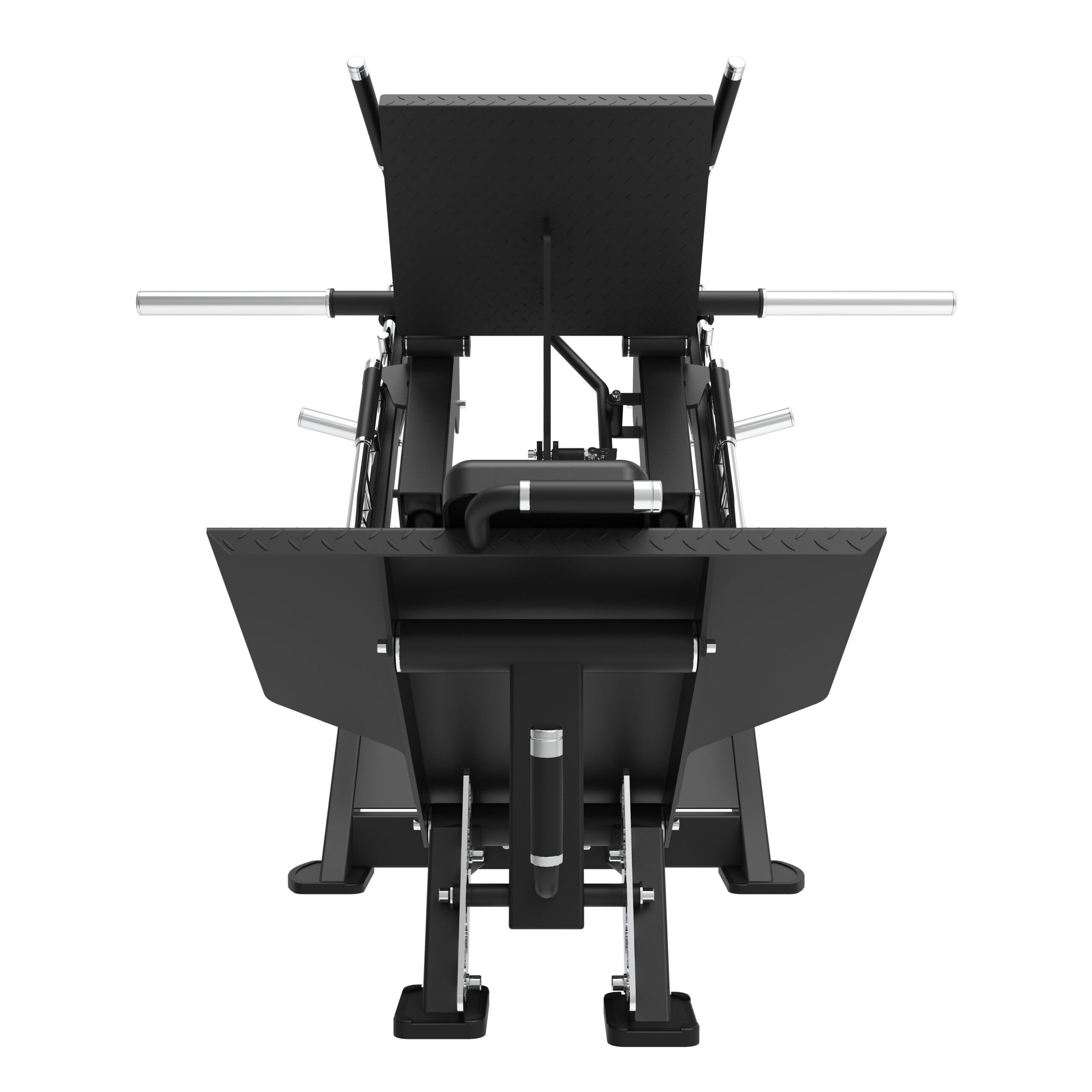 Vores professionelle Dual Hack Squat/Linear Leg Press maskine er designet til effektivt at målrette benmusklerne i en siddende/stående position. Maskinen er udstyret med en 5-trins skridsikker justerbar platform til fødderne, i Hack Squat funktionen, samt polstrede skulderpuder for støtte og komfort. Ligeledes er maskinen udstyret med en vipbar skridsikker platform til fødderne, samt et 5-trins polstret sæde, i Linear Leg Press funktionen. Dette gøre det let for brugeren at indstille den ønskede startposition for øvelserne. Her får man en meget alsidig maskine, der giver mulighed for at træne to forskellige slags øvelser. Maskinen har to “load sleeves” på armene til belastning med alle Ø50 mm vægtskiver. Der er desuden monteret to vægtskive pins på hver side af maskinen til opbevaring af vægtskiver.