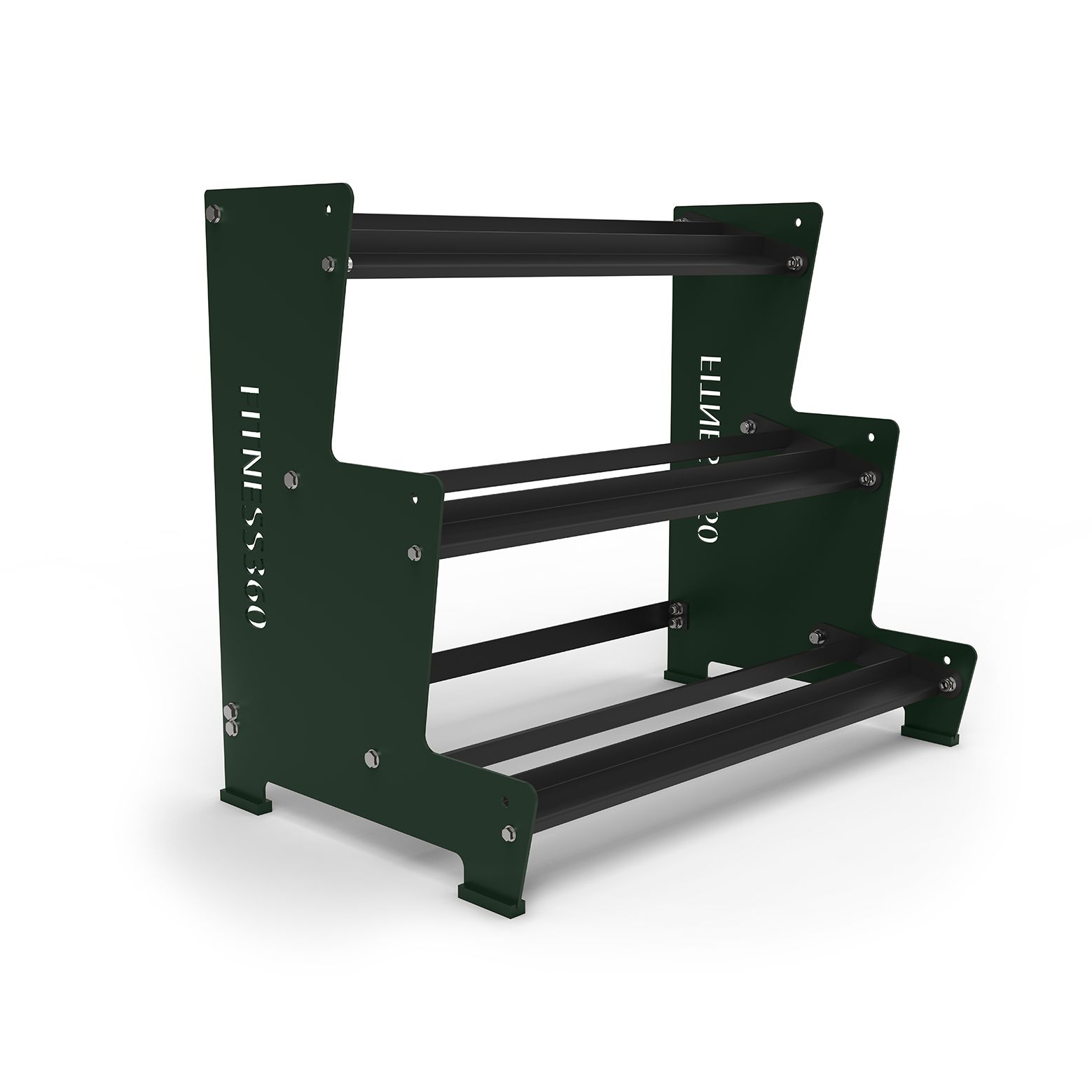 Dumbbell rack med 3 hylder i forskudte niveauer. Ideel til opbevaring af håndvægte mellem 10 kg og 40 kg, grundet størrelsen på hylderne. Denne opbevaringsløsning er ideel til placering under spejle eller vinduer, grundet den lave højde på reolen. Denne dumbbell rack model fås også i en længere version på 180 cm i bredden. Du kan altid kombinere/tilføje flere korte sektioner, hvis behovet for mere opbevaring opstår.