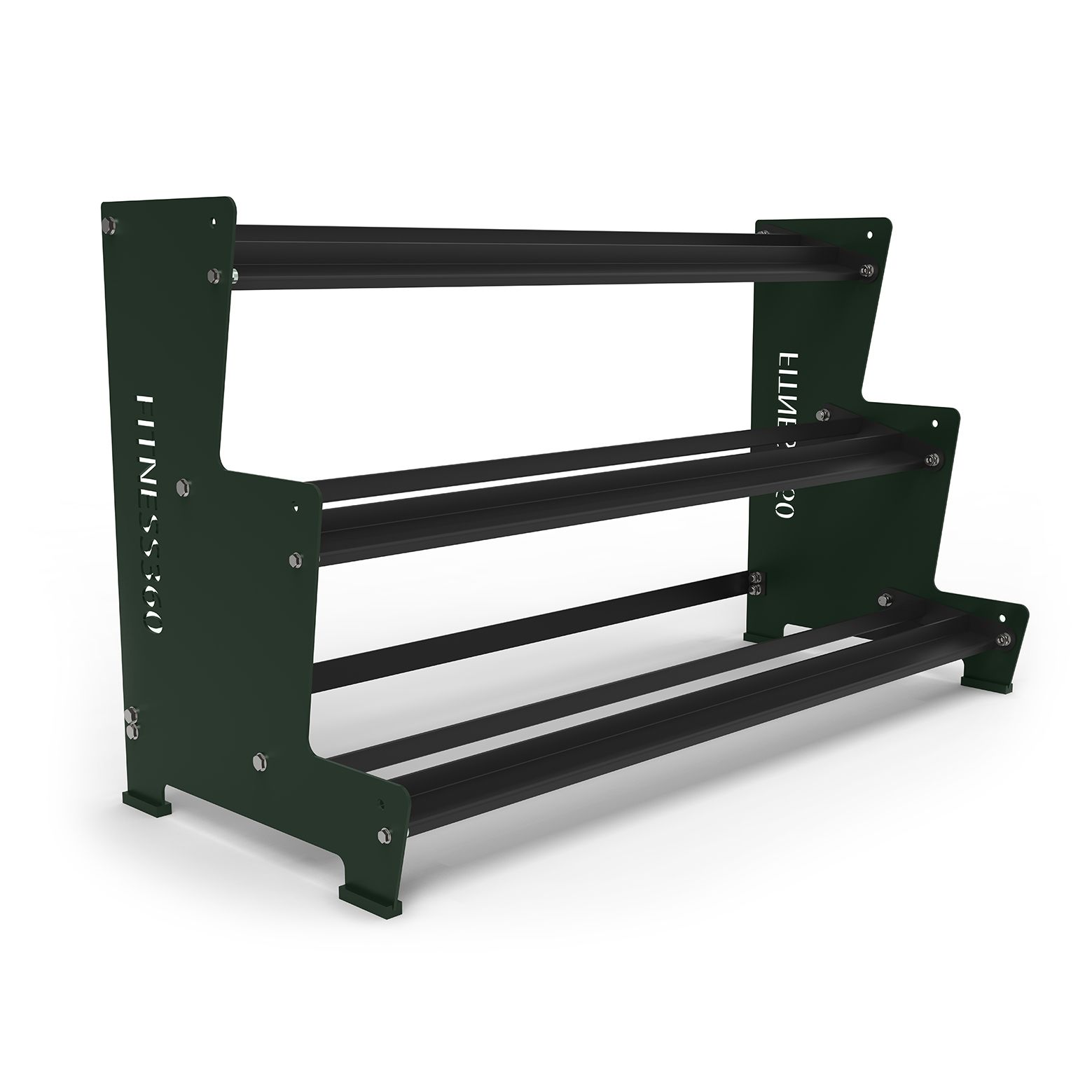 Dumbbell rack med 3 hylder i forskudte niveauer. Ideel til opbevaring af håndvægte mellem 10 kg og 40 kg, grundet størrelsen på hylderne. Denne opbevaringsløsning er ideel til placering under spejle eller vinduer, grundet den lave højde på reolen. Denne dumbbell rack model fås også i en kortere version på 120 cm i bredden. Du kan altid kombinere/tilføje flere korte sektioner, hvis behovet for mere opbevaring opstår.