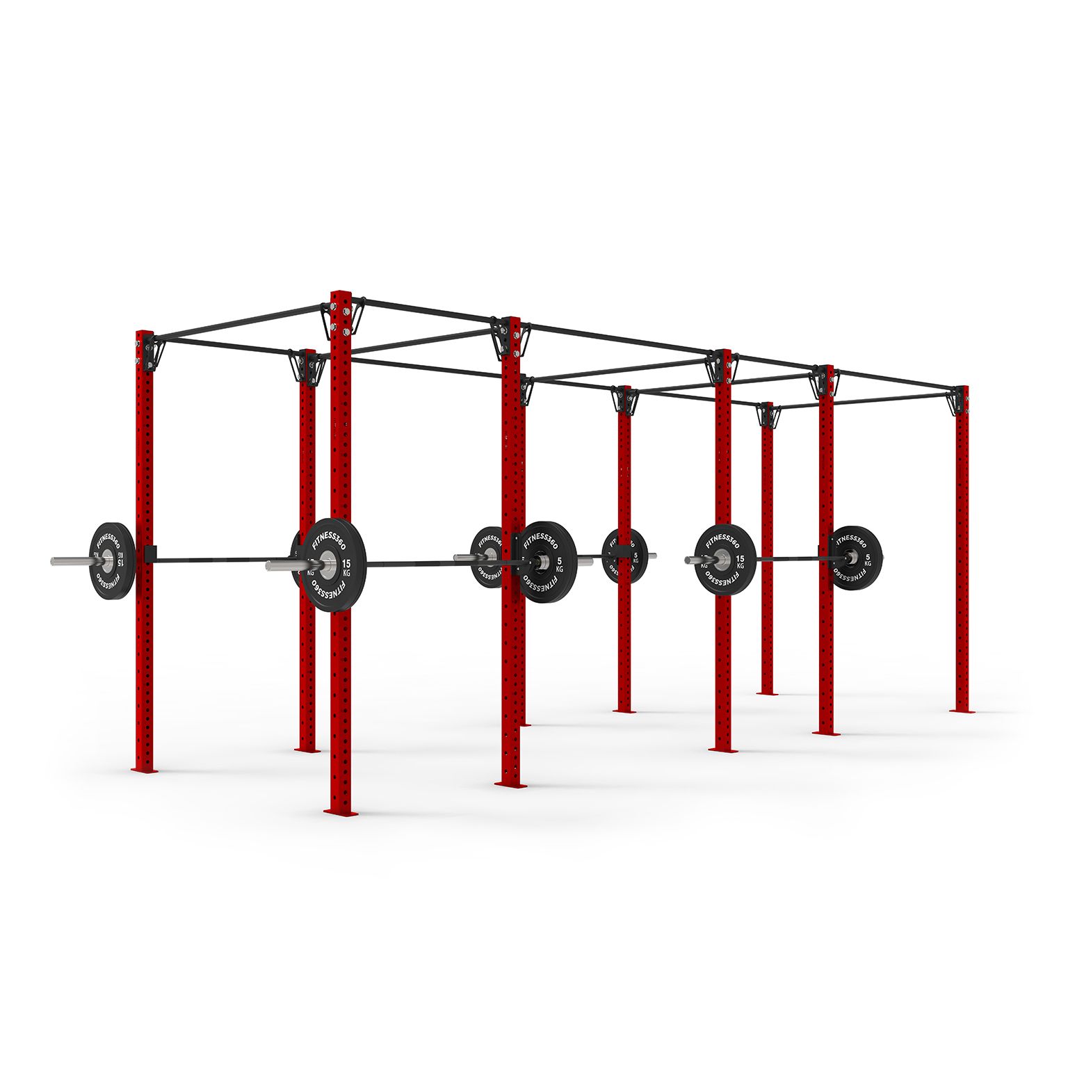 Dette fritstående rig består af 10 stk. stolper på 256 cm, 9 stk. pull up bars på 180 cm og 4 stk. pull up bars på 108 cm. Stolperne skal fastgøres i gulvet.
