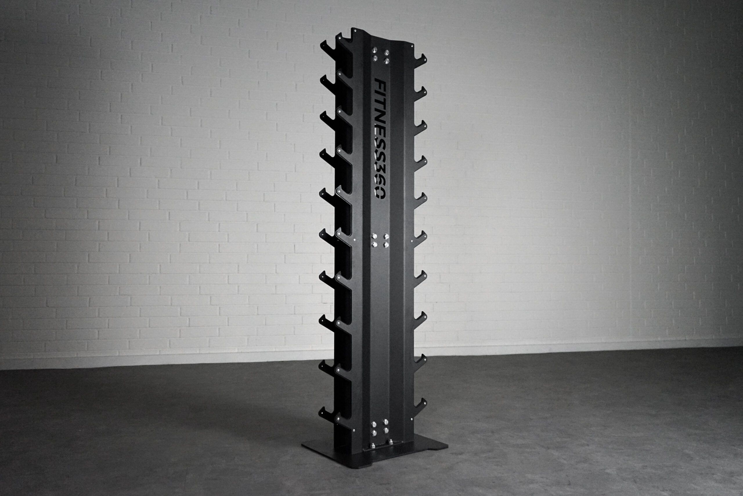 Håndvægtstativ med plads til opbevaring af mindre håndvægte/dumbbells. En pladsbesparende løsning der er ideel til både home gyms og kommercielle lokationer. Hjælp dig selv (eller dine medlemmer) med at holde orden på håndvægtene, ved at fremvise udvalget af dumbbells på en pæn og overskuelig måde. Det er træls for alle, når håndvægte ligger og flyder på gulvet, og det er uoverskueligt at finde den rigtige. Du vil med garanti få stor glæde af dette håndvægtestativ! Tårnet har en solid base, og føles meget eksklusiv i sit udseende og kvalitet. Hver “hylde” til håndvægtene skråner naturligvis indad, så håndvægtene forbliver i tårnet.