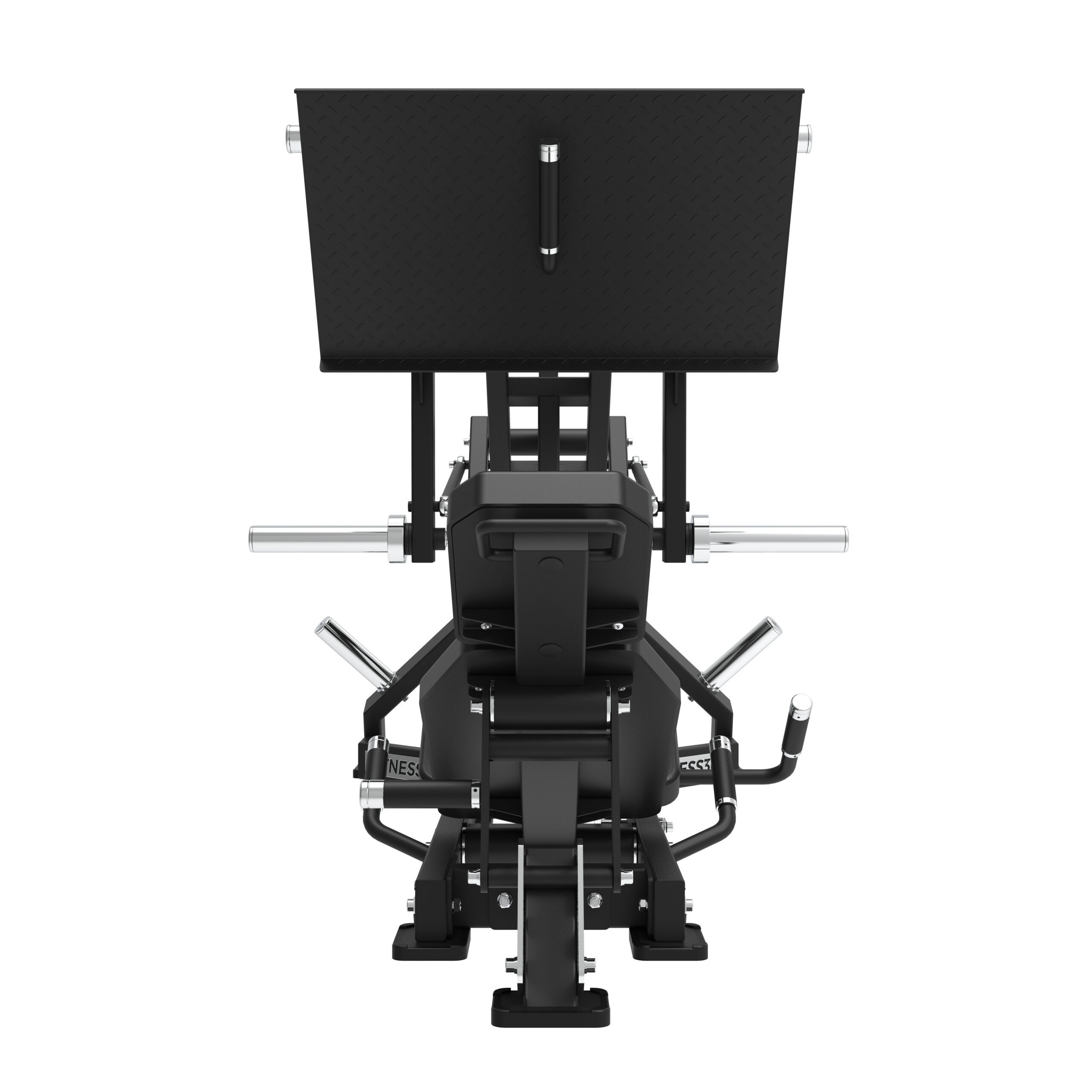 Vores professionelle Leg Press maskine er designet til effektivt at målrette benmusklerne i en siddende position. Maskinen er udstyret med et 3-trins justerbart sæde, hvilket giver brugeren mulighed for let at indstille startpositionen for øvelsen. Maskinen har fire “load sleeves” på armene til belastning med alle Ø50 mm vægtskiver. Der er desuden monteret to vægtskive pins på hver side af maskinen til opbevaring af vægtskiver.