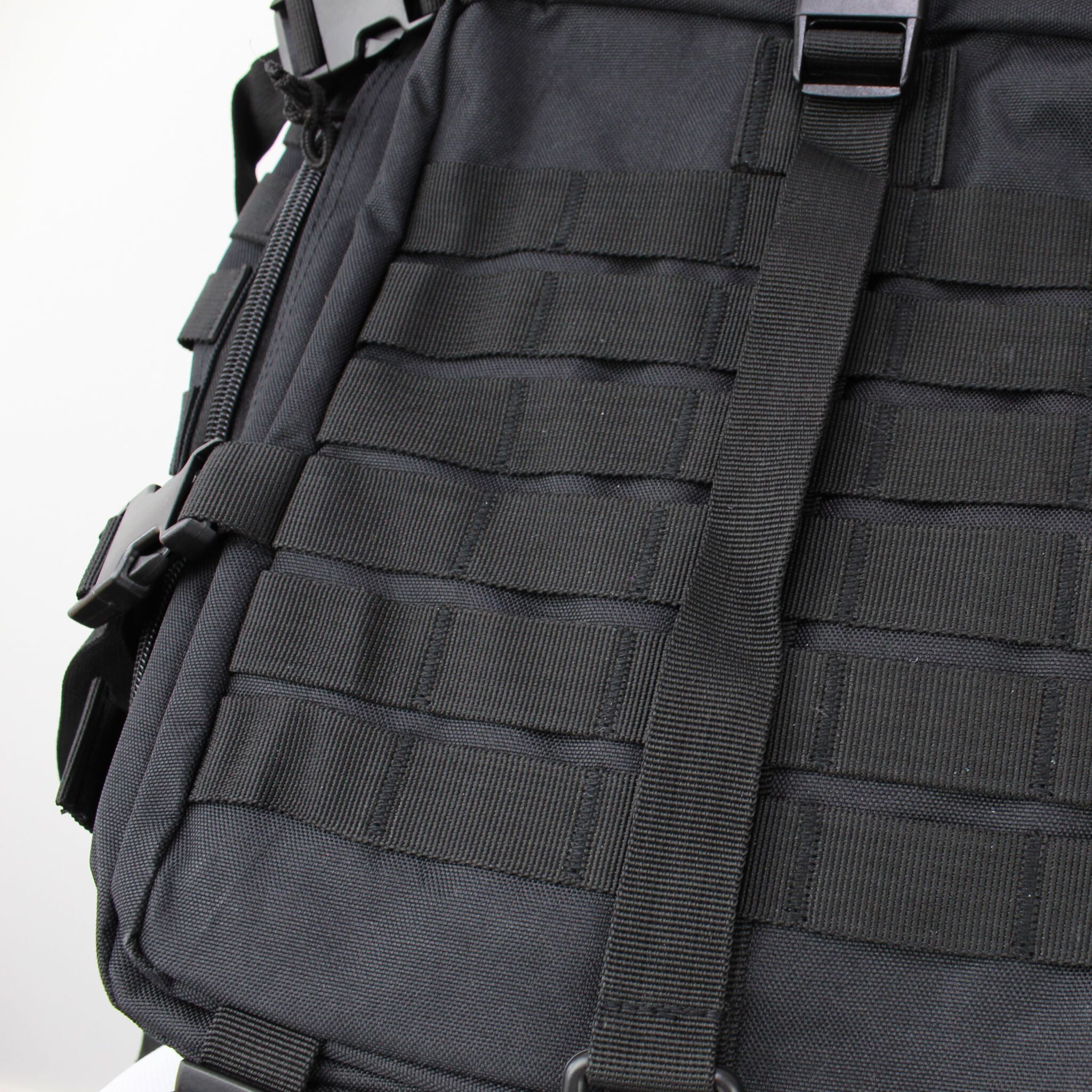 Fitness360 Militær Rygsæk i sort med cirka 45 liters kapacitet. Den store rummelighed og funktionalitet giver dig en rygsæk med alt hvad du har behov for. Tasken har to store lommer, plus to lynlåslommer på ydersiden. Inde i hver lomme er der adskillige mindre net- og elastiklommer, der gør organisering i den store taske nem. Alle lommer kan åbnes/lukkes med two-way lynlåse.