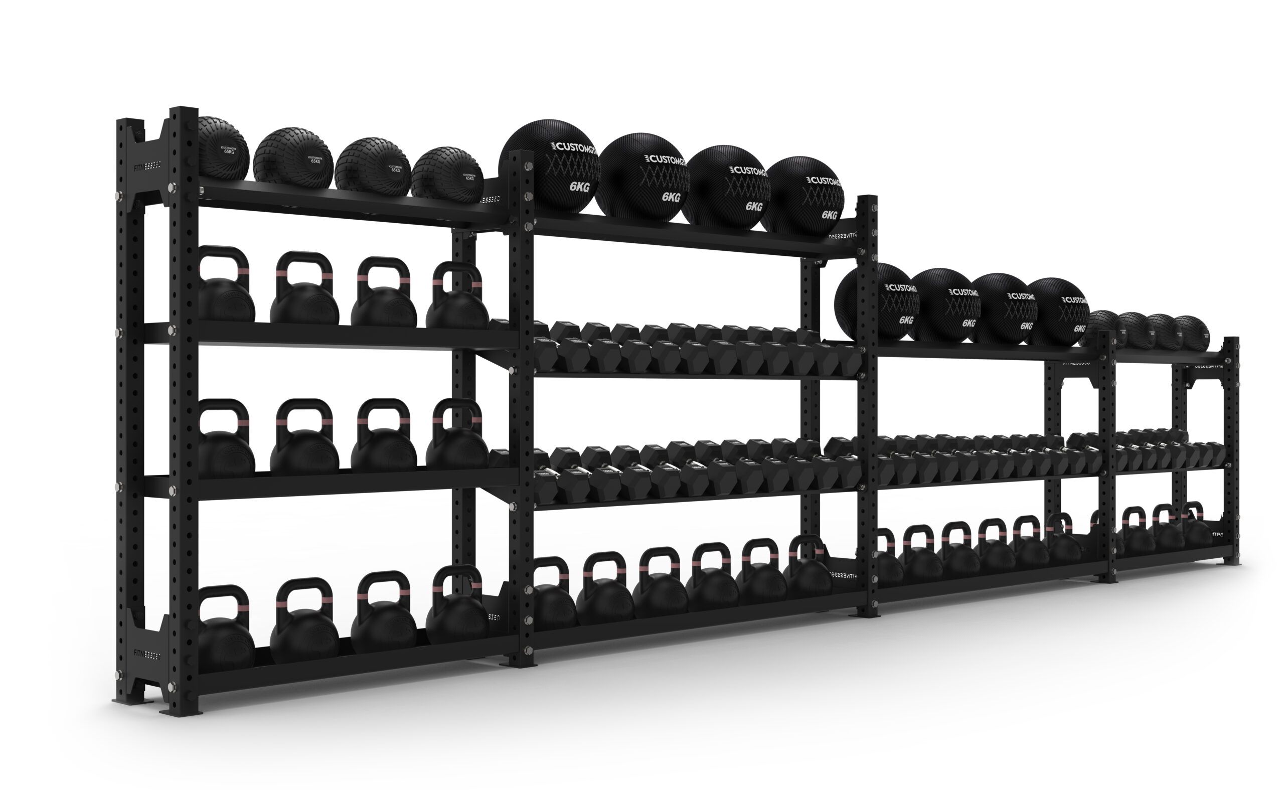Reolsystem til kettlebells med 3 hylder. Ideel til opbevaring af kettlebells, grundet størrelsen på hylderne. Denne opbevaringsløsning er ideel til placering under spejle eller vinduer, grundet den lave højde på reolen. Denne reolsystem model fås også i en længere version på 180 cm i bredden. Du kan altid kombinere/tilføje flere korte sektioner, hvis behovet for mere opbevaring opstår.