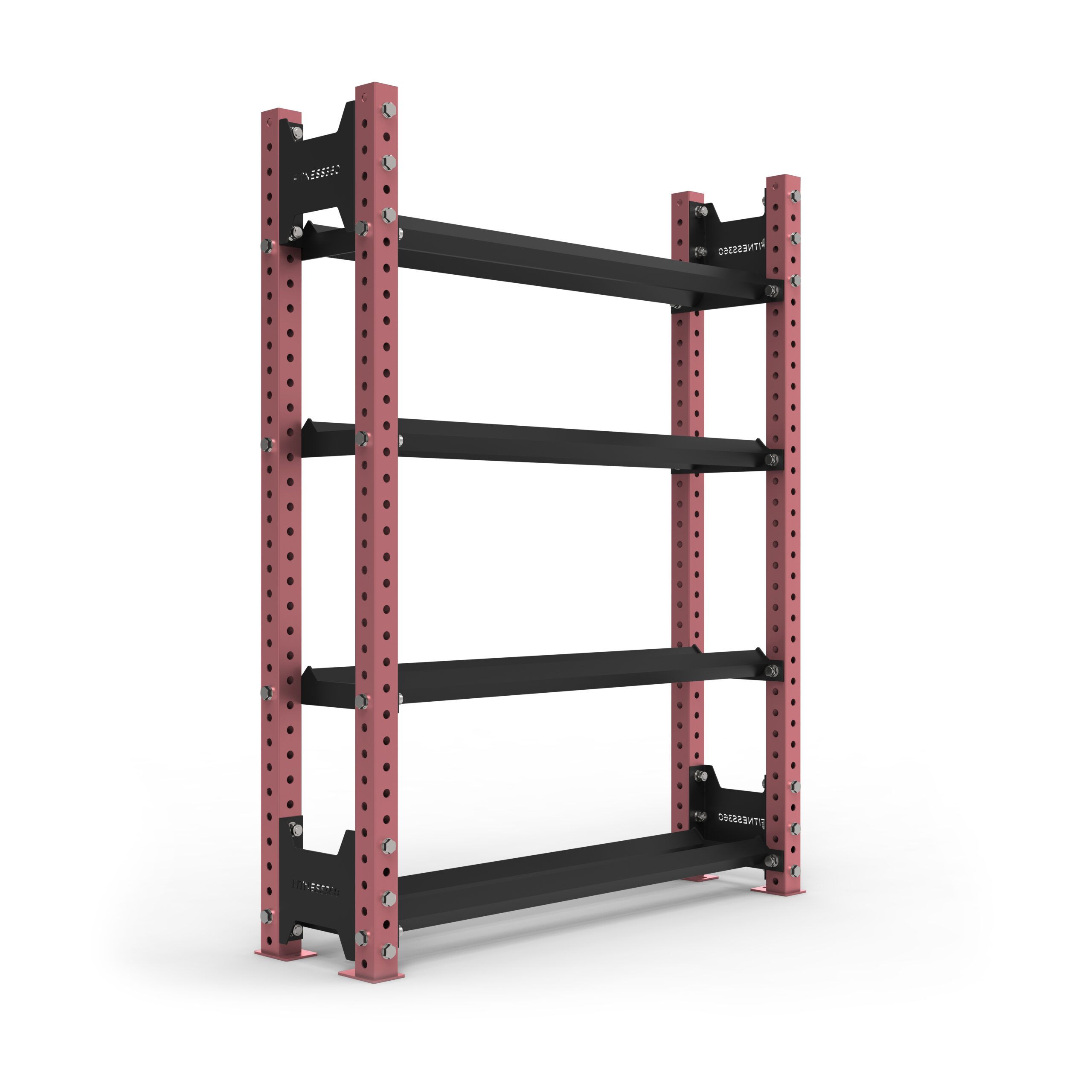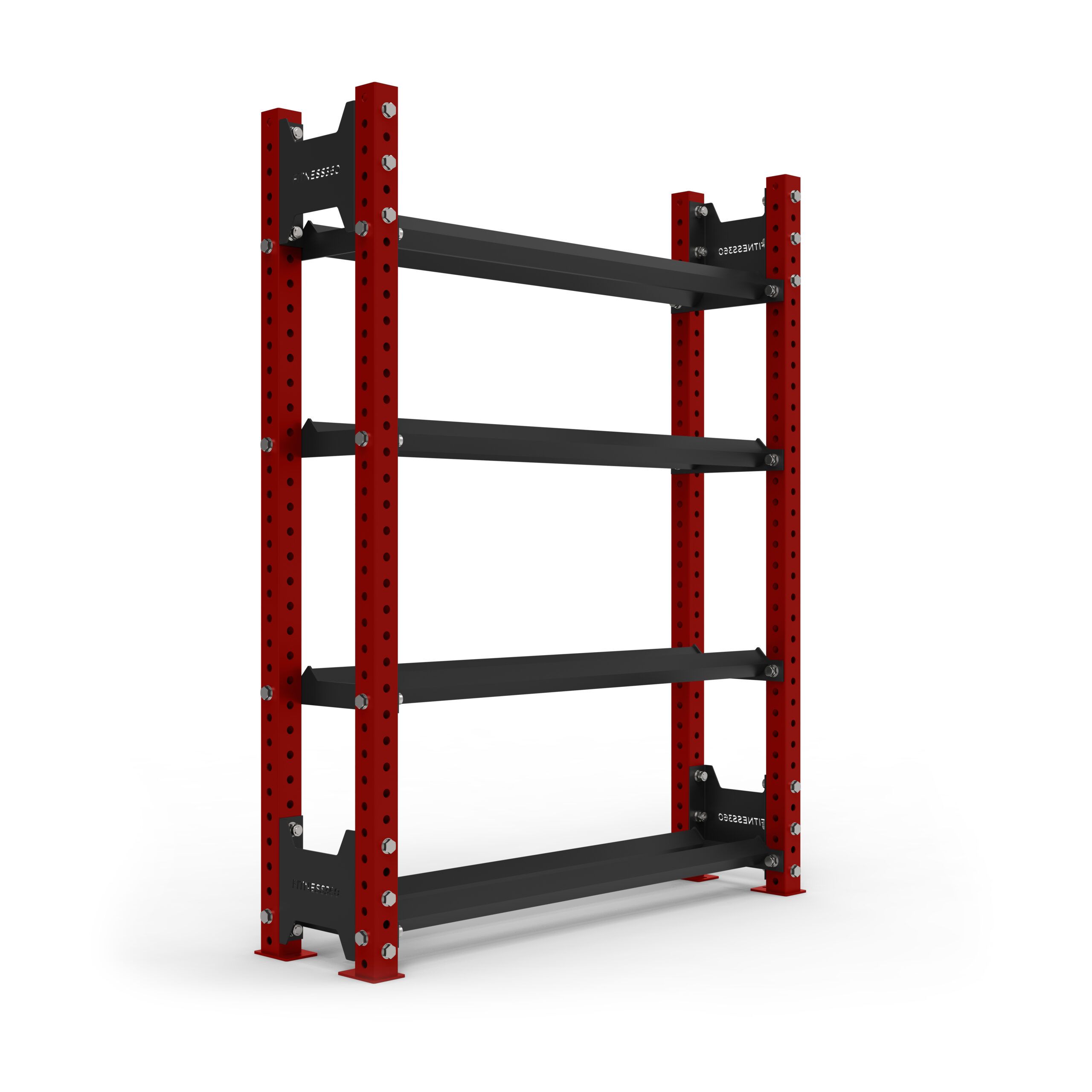 Reolsystem til vægtskiver og bolde med 4 hylder. Ideel til opbevaring af vægtskiver og bolde, grundet størrelsen på hylderne. Denne opbevaringsløsning er ideel til placering under spejle eller vinduer, grundet den lave højde på reolen. Dette reolsystem fås også i en længere version på 180 cm i bredden. Du kan altid kombinere/tilføje flere korte sektioner, hvis behovet for mere opbevaring opstår.