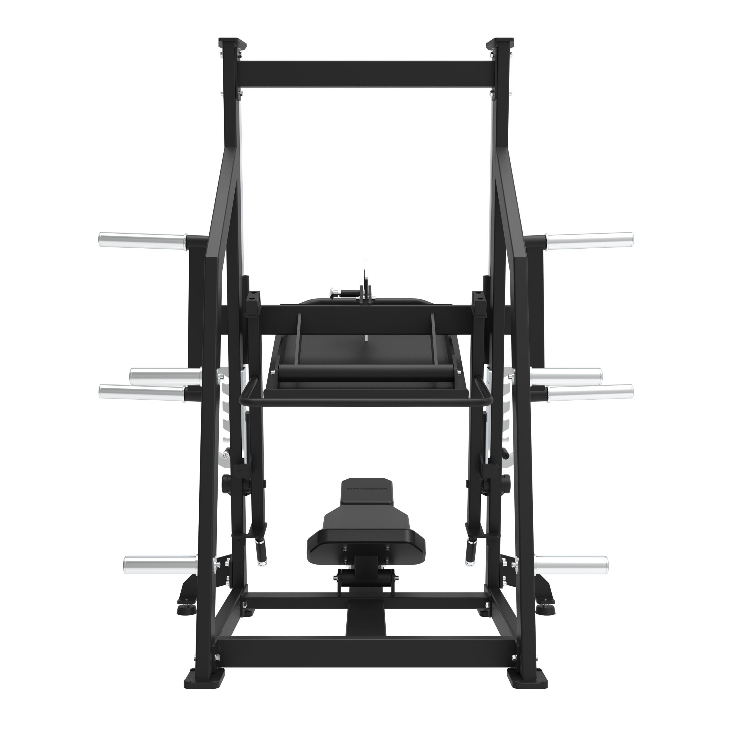 Vores professionelle Vertical Leg Press maskine er designet til effektivt at målrette benmusklerne i en liggende position. Maskinen er udstyret med et 3-trins justerbart sæde, samt en 4-trins justerbar fodplade, hvilket giver brugeren mulighed for let at indstille startpositionen for øvelsen. Maskinen har fire “load sleeves” på armene til belastning med alle Ø50 mm vægtskiver. Der er desuden monteret to vægtskive pins på hver side af maskinen til opbevaring af vægtskiver.